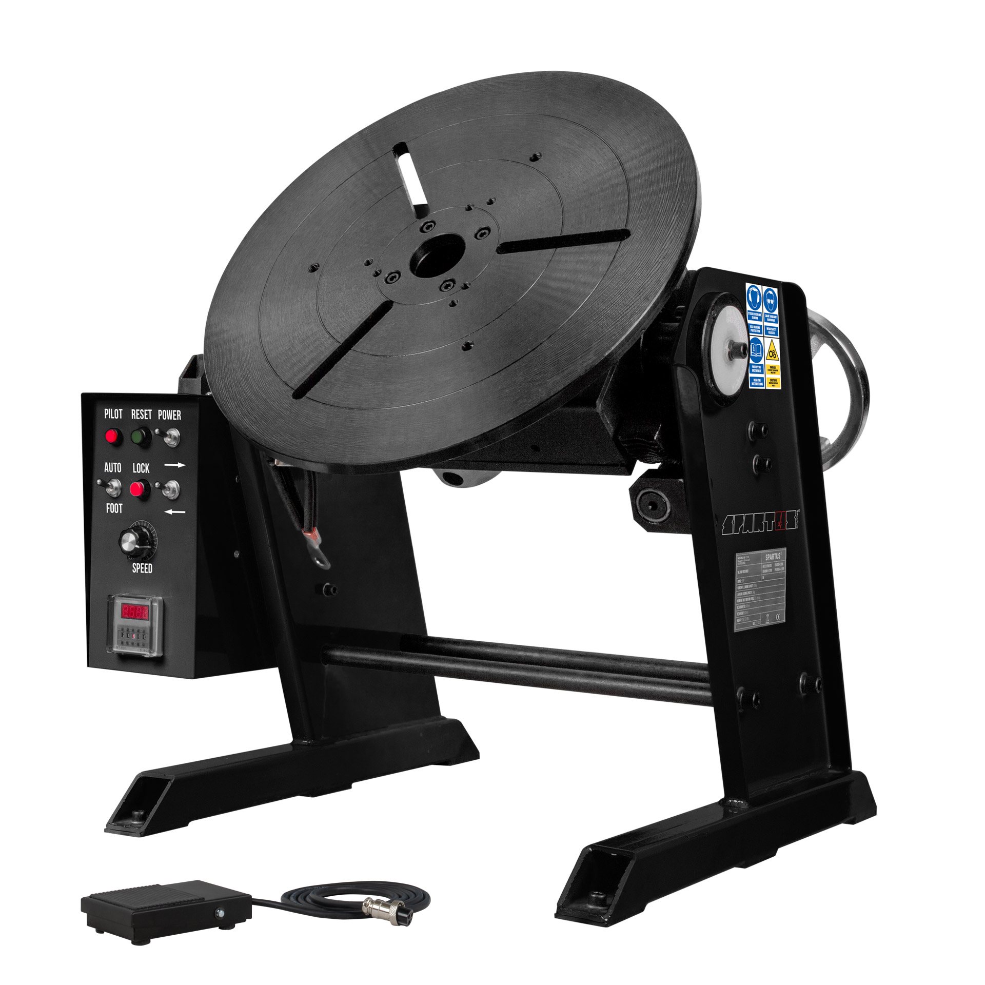 The SPARTUS 100P welding positioner is a modern device that supports the welding process, enabling precise rotation and positioning of elements with a maximum load capacity of 100kg. Powered by a single-phase 230V supply, it ensures convenient and versatile operation in various workshop conditions. Smooth rotation speed adjustment and the ability to change the rotation direction allow for optimal positioning of the workpiece, increasing welder comfort and improving the quality of welded joints. A robust construction and simple control panel make the SPARTUS positioner a reliable tool for both series production and single-piece work.
